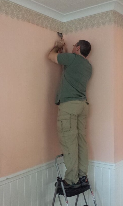 huge mushroom, involving new windows, structural stuff, insulation, etc.), I did not want the border to just end. So, faithful Paul undertook the painstaking task of removing it. This is not an easy task. But he did it, and it is rolled up, waiting to be reapplied once the new wallboard is up. (More to follow in upcoming post once complete.)